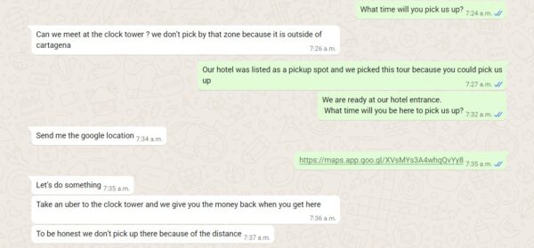 If you are considering booking with this operator, proceed with extreme caution. And if hotel pick-up is important to you in Cartagena, do not rely solely on what a listing says — even when it is confirmed in writing.