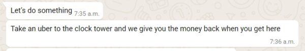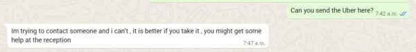 What convinced us to proceed was the explicit written assurance, sent via WhatsApp, that the Uber would be reimbursed when we arrived. We were told to notify them once we were en route.