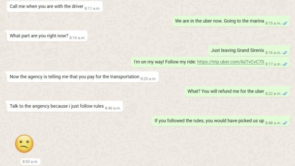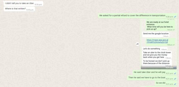 This email was not only late, it was impossible to act on. Taking an Uber downtown at that point would have caused us to arrive after the bus had already left, forcing us to scramble yet again to reach the dock. By then, we were already en route based on the WhatsApp instructions and the written promise of reimbursement.